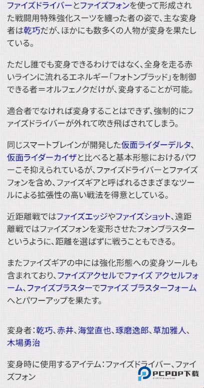 1、穿着使用Faiz驱动器和FaizPhone形成的特殊强化战斗服的人的姿态,主要变身者是乾巧,但是还有很多人也完成了变身。