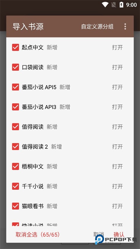 4、显示可选书源列表时,自由勾选单个或多组,或者全选 + 自定义分组名来归类管理。