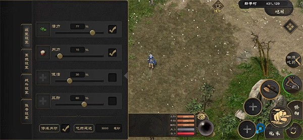 3. 恢复设置: 玩溜了能省不少药。比如活力药设置 70%,就是说活力一掉到 70% 以下,角色自己就吃生药。“吃药延迟” 设 1000 毫秒(等于 1 秒),就是每隔 1 秒检查一次要不要吃药。再看那个 “修炼三攻” 选项,勾上有什么用?勾上后能让内功上限慢慢增加!怎么加?当你内功消耗到不足 10%,再把内功补满(比如吃汤药),就有可能提升一丁点内功最大值(提示:活力 + 内功 决定了呐喊等级)。