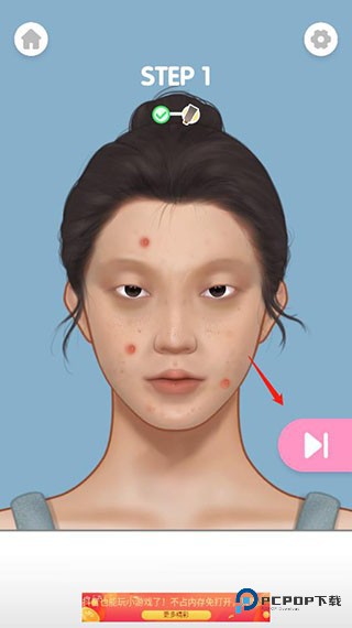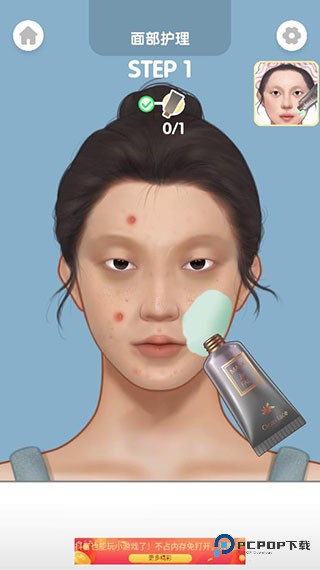 3、化妆的第一步通常是美化皮肤,这时候记得跟着游戏里的教程提示,选择合适的工具让模特的肌肤变得平滑细腻。
