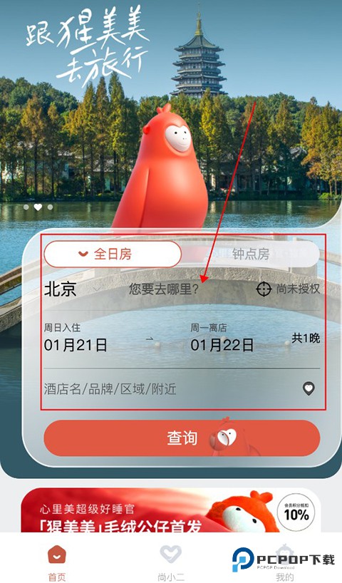 把 APP 下好打开,进到首页就能看到。在上面那里把想去的地方、哪天住哪天走这些选好,然后点 “查询” 就行。