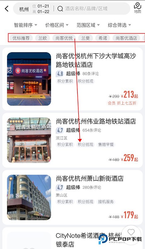 酒店列表出来之后,上面一排可以选你想要的酒店品牌,往下拉也能看 APP 推荐给你的酒店。看到顺眼的就点进去。