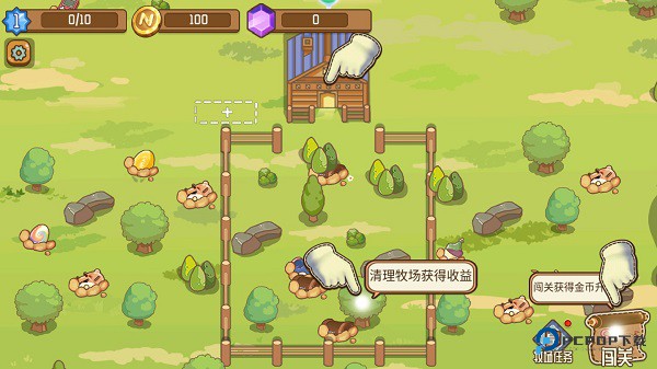 熟悉了逗牛比赛的基础后,回到牧场建设上。清理地面杂草可以收获小收益,挑战各种关卡能提升比赛的难度水平;升级牧场的建筑设施,不仅能解锁稀有牛种,还能把土地范围扩得更大哦。