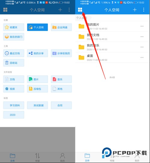 文件位置切换 通过左上角的按钮,可以找到其他的文件快捷入口,进入不同的目录对文件进行管理。在快捷入口,KODBOX 提供了不同的分类和快捷跳转入口。