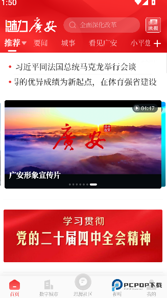 1、打开魅力广安软件进入首页,在页面上方推荐区域浏览本地新闻、热点资讯及专题内容,点击即可查看详情。