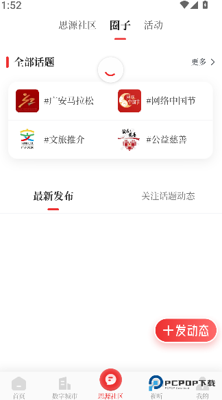 3、通过底部导航栏进入 “思源社区”,选择动态发布相关入口,填写内容、上传素材后完成发布操作。