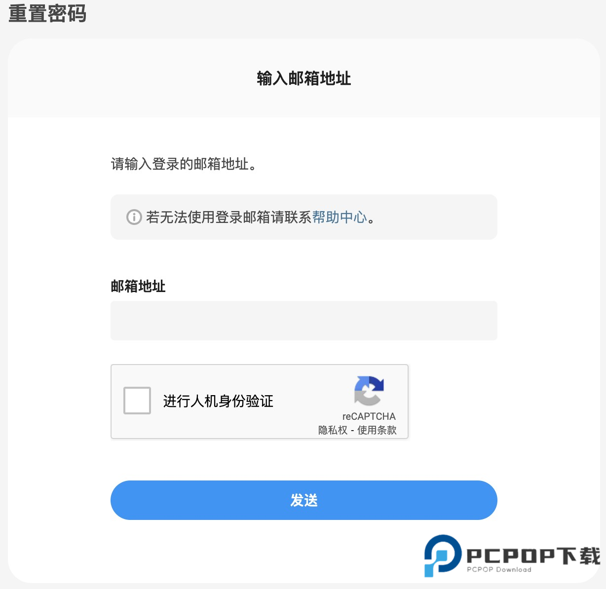 1、在重置密码页面的邮箱地址栏输入邮箱地址,勾选「进行人机身份验证」后点击「发送」按钮。