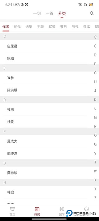 2、诗词界面可以从各种分类来了解,软件也会每天推一句、一首