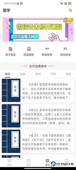 3、在国学界面可以从褚子百家,成语典故,神话故事,民间谚语等方面来查找
