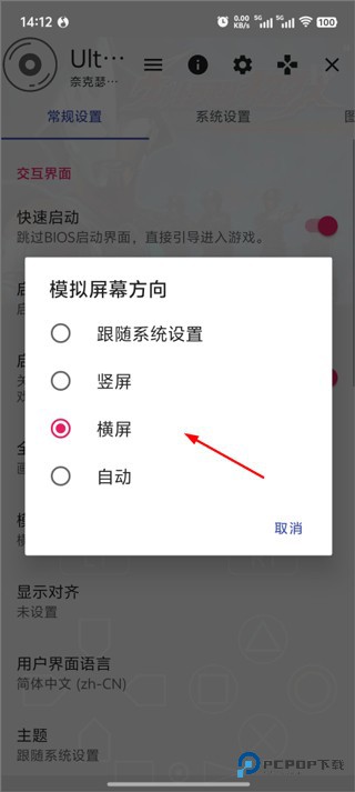 3、然后找到屏幕方向,选择模拟屏幕方向为横屏;