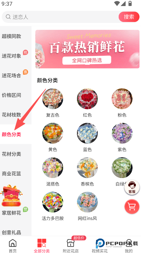1、分类维度贴合鲜花需求,颜色等分类清晰,快速缩小选花范围,有效提升鲜花选购的效率。