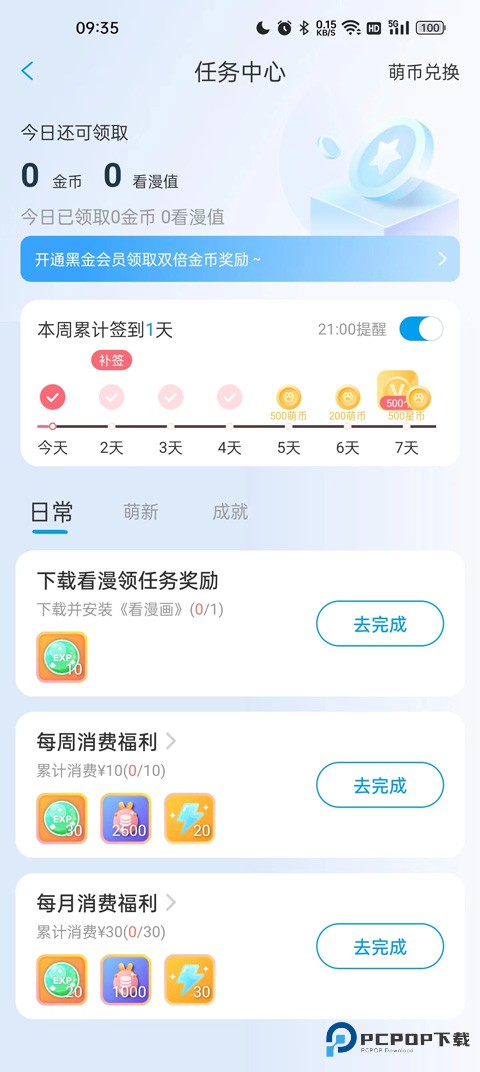 4、之后会来到任务中心页面,完成下列相应的任务可以获得萌币奖励。