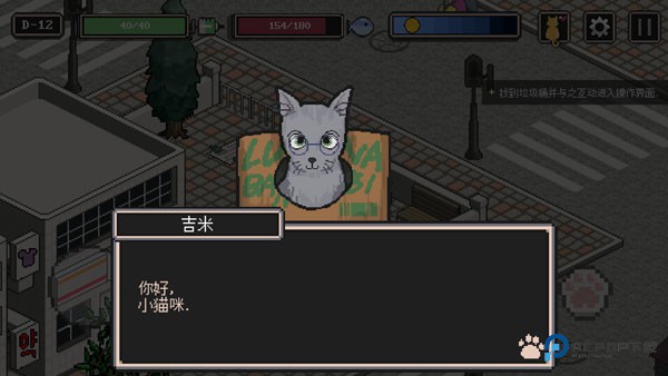 翻找垃圾堆、纸箱、罐头获取食物与道具,拿到道具后点击即可食用,将特定道具送给NPC可增加好感度,交给门口的猫咪可升级猫窝,获得更多体力健康与对话次数。