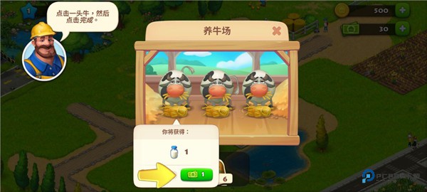 5、按照教程提示,点击奶牛,即可收获牛奶;