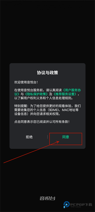 1、在本站下载并安装音悦台app最新版后,初次进入应用需要阅读并同意隐私协议,点击同意即可进入应用。