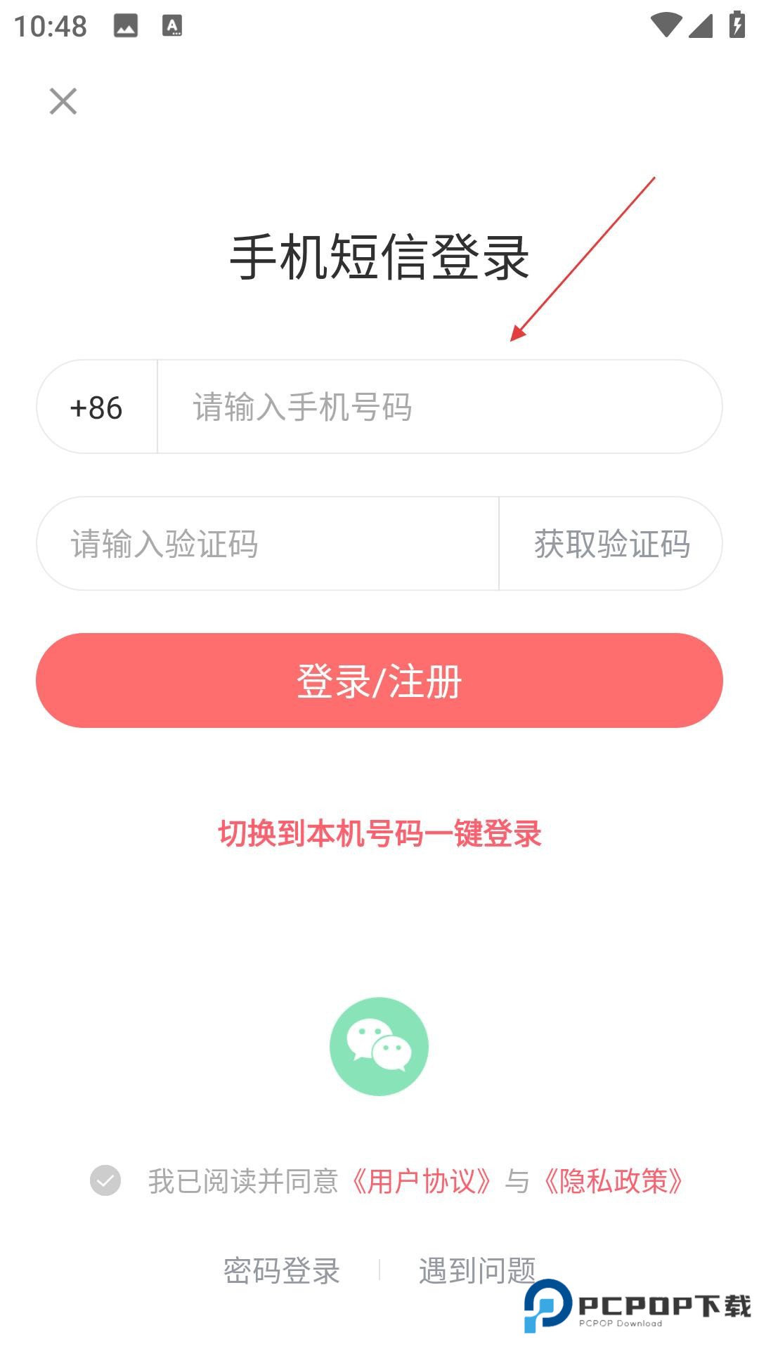 2、进入登录页,用手机号验证码方式,或切换本机号、微信登录,完成后,使用APP功能。
