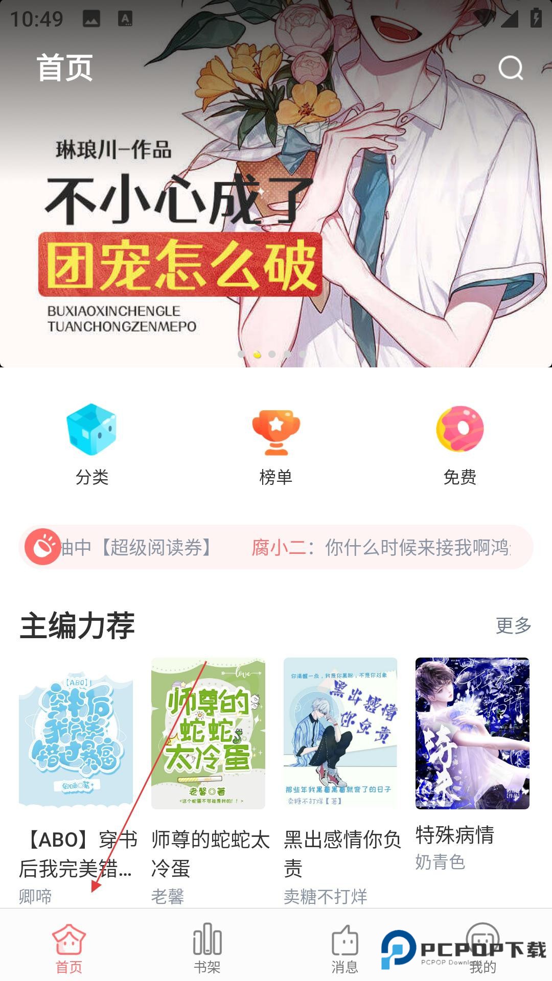 3、进入主界面,看轮播推荐、分类导航,通过主编力荐找优质小说,或用搜索、榜单,发现内容。