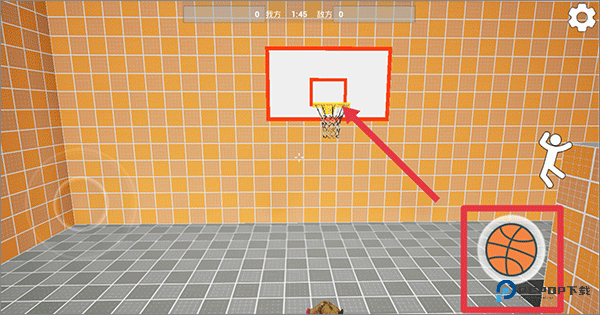 3、然后把球运到自方篮球框下点击篮球的图标进行投篮,最先到达分数的人获得胜利