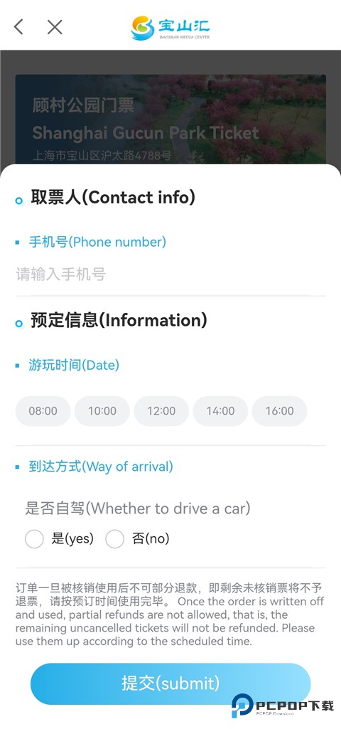 3、将取票人信息以及游玩时间填写完毕后,点击提交即可预约。