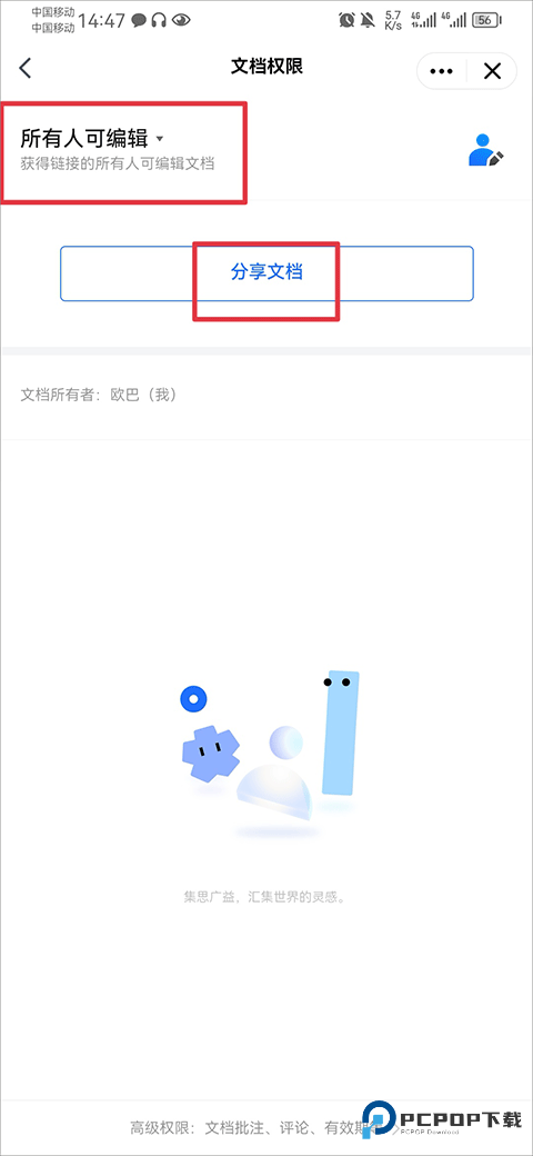 6、将权限设置为所有人可编辑,然后点击分享文档将文档分享给好友