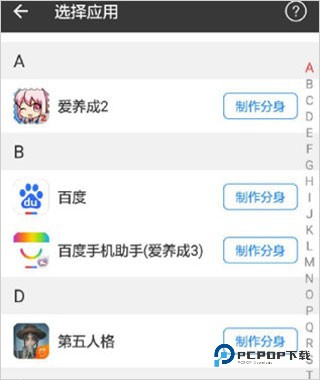 2、点开加号以后会显示你自己手机里的软件,点击字母选择软件制作相应分身。