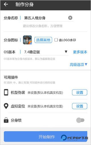 4、输入分身名称、分身图标,选择OS版本,目前可用插件有限,包括机型伪装、虚拟定位、分身锁。