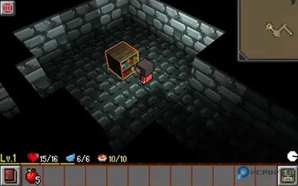 6、游戏中的一些房间内还会遇到道具箱子,有的是补血的,有的是装备,有的是物品等,我们都可以攻击这些木箱来收集。