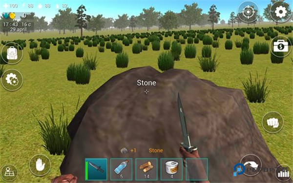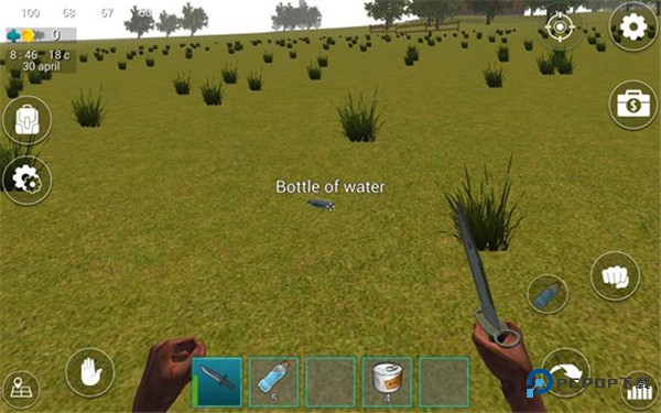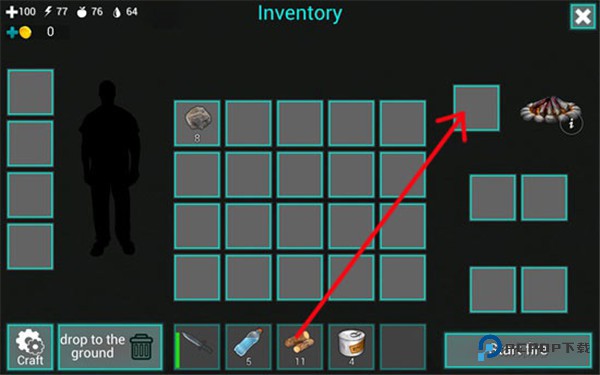 在屏幕下方的道具栏中有一把匕首和5瓶水,我们点击匕首即可拿在手中。在屏幕左上角有四个图标数字,分别表示血量、体力值、饥饿值、口渴值。