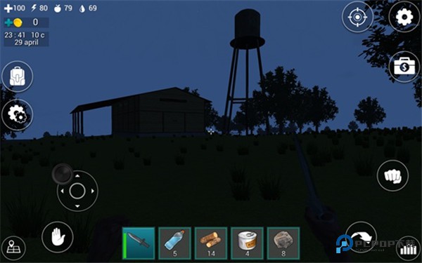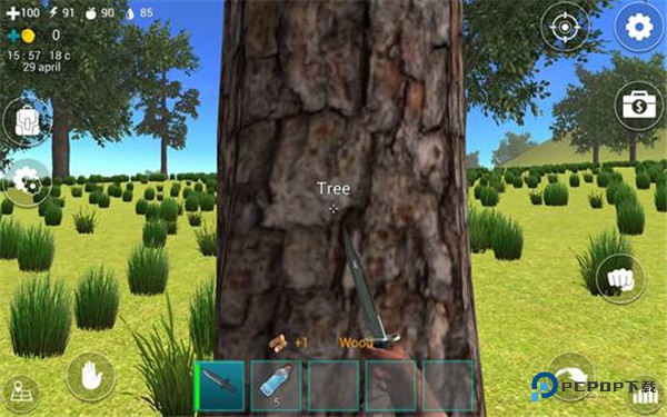 我们沿着海岸线朝着水塔走去,在路上可以用匕首对着树干,然后点击右侧“拳头”攻击按钮,可以获得木头,这是后期生存所必备的材料。