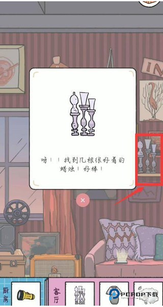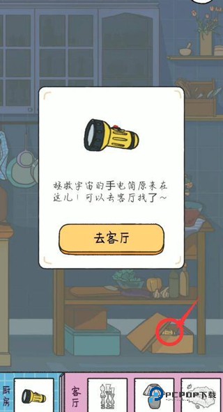 2、出发去厨房吧,检查桌子上的箱子,能翻出手电筒来。
