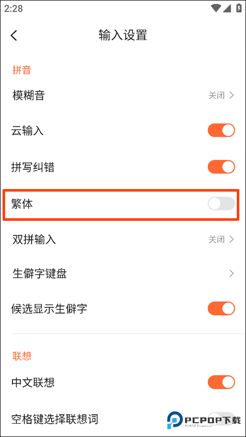 3、然后,在输入设置当中点亮繁体选项即可开启繁体输入了。