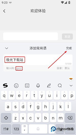 4、按照图中示例输入常用语的内容和输入码,点击【完成】,之后就能使用输入码或在常用语中一键输入了。