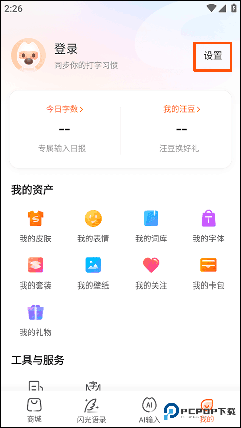 1、打开下载安装好的搜狗输入法,在我的界面找到并点击“设置”功能选项;