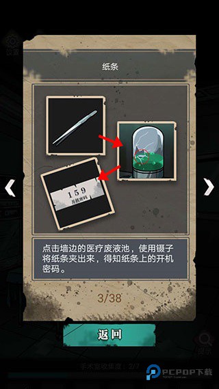 1、只要跟着教程走就行。注意拿到摄子后点右边药罐,拿到密码牌后点左边机器,输入密码,拿钥匙开门。
