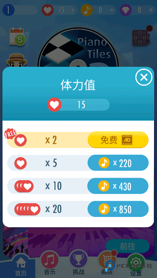 歌曲获得高分后会奖励体力:超过100分奖励2点体力,超过220分奖励5点体力,超过430分奖励10点体力,超过850分会获得20点体力