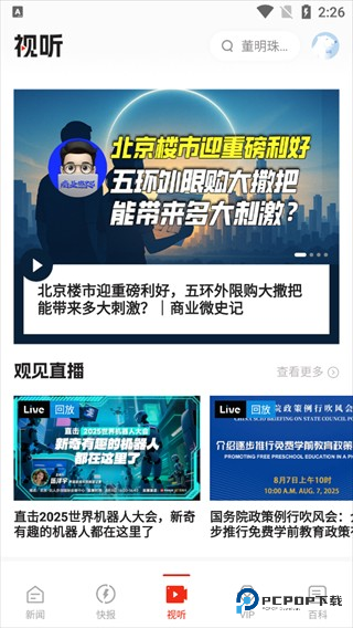 提供视频类内容,有楼市解读、直播回放等,涵盖财经、社会等主题,丰富信息呈现形式。