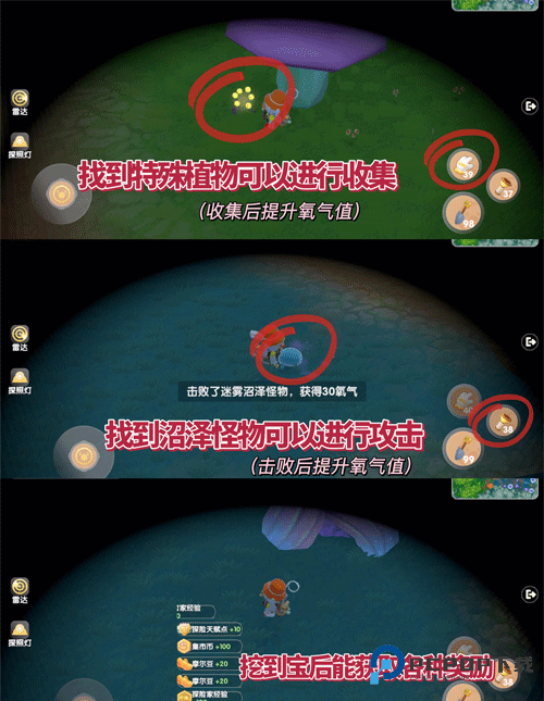 注意左上角那个 “氧气值”,整个队伍是共享的!路上看到小怪物或者亮闪闪的特殊植物,一定记得顺手收集它们,氧气值就靠它们补充啦。