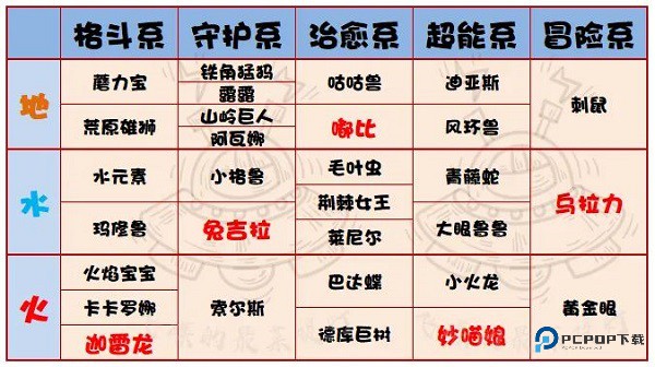 收录 63 只契约兽,分属水 / 火 / 土三系属性及格斗 / 守护 / 治愈等 12 种类型。