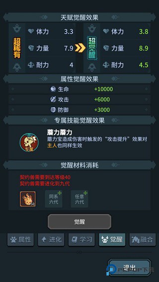 稀有契约兽觉醒后外观重塑,战力增幅最高达 200%。
