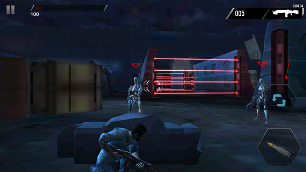 屏幕左侧控制械瞄准,只要对准敌人之后,就可以开始射击。右侧可以开火、切换武器,射击时对准敌人开火即可。松开主角人物,就会自动的躲入掩体里。在敌人射击的空闲时间,我们一定要快速的离开掩体射击,这样才可以快速的击杀敌人。