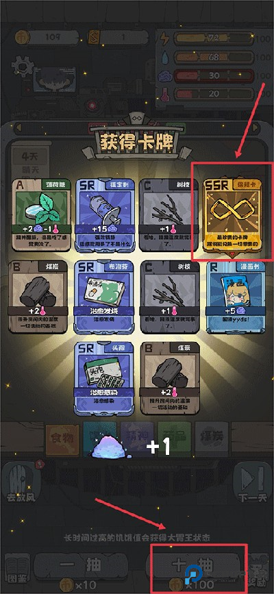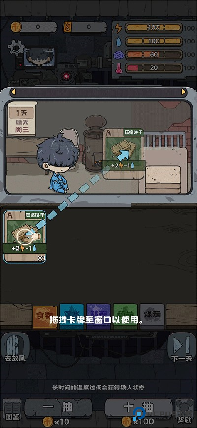 8、想熬过这一百天,光顾着抽卡换卡可不行呐,身体状态很关键!要是饥饿值、健康值之类掉太低了,记得及时找出能恢复的卡牌,直接把它拖到状态显示的那个小窗口就能用掉补状态了。