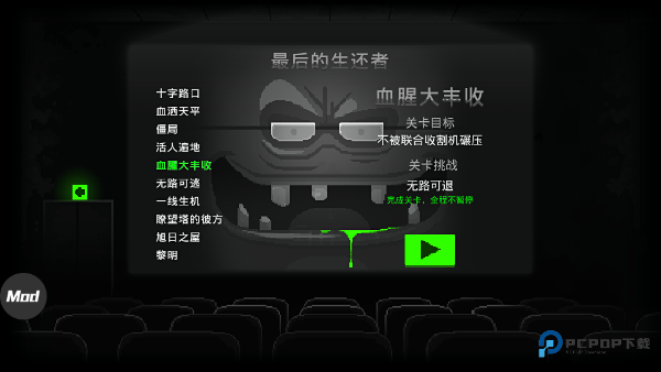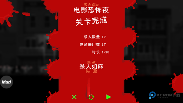 1、该游戏有特别的多的模式,每种模式中还包含特别多的玩法,下面进入第一个知名感染模式,选择电影恐怖夜,这个关卡目标是感染3个人类,然后杀死14个人即可挑战成功,接下来点击绿色的播放键开始游戏吧。