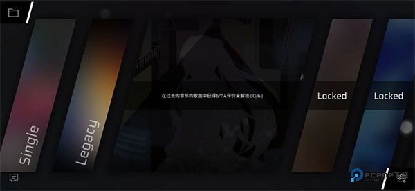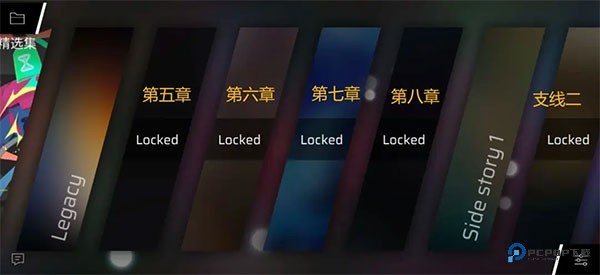 刚进入游戏会看到一大堆 Locked ,对应的章节如下图黄字标注。支线二的右边还有一个支线三章节。推荐一开始从左数第二的 Legacy章节开始往后玩,按顺序解锁,最左的单曲精选集当作买歌商店。(Legacy章节现包含第一到第四章)