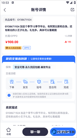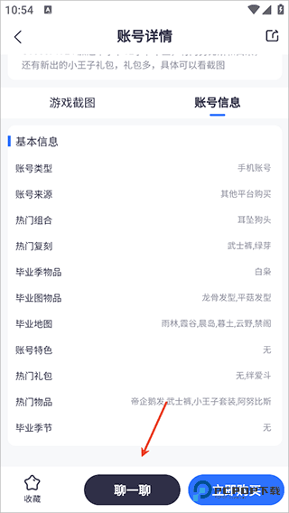 4、如果对交易流程或游戏账号信息还要进一步了解可以点击【聊一聊】,与交易对方进一步沟通