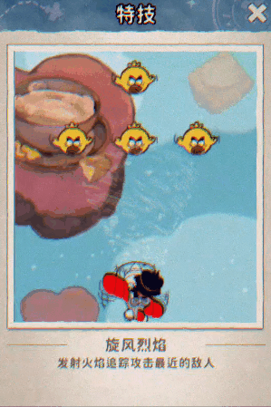 特技:【旋风烈焰】 - 吸入敌方粉色弹幕后触发,发射火焰追踪最近的敌人,自动锁定,让敌人无处遁形!