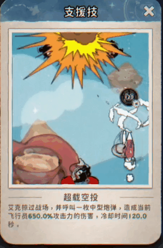 羁绊支援(艾克):【超载空投】- 艾克呼叫支援,驾驶战机掠过战场,并投下一枚中型炮弹,对范围内的敌人造成极为强大的区域毁灭性打击! 空中支援,火力覆盖!