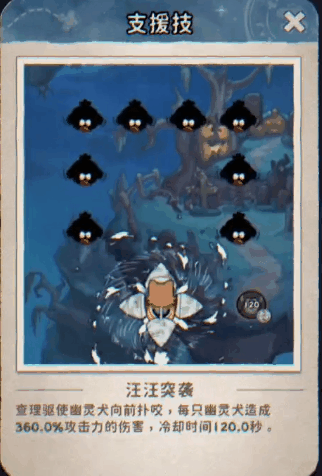 羁绊支援(查理):【汪汪突袭】- 查理驱使幽灵犬向前发动迅猛扑咬,对路径上的敌人造成强力伤害! 幽影突袭,撕咬敌阵!