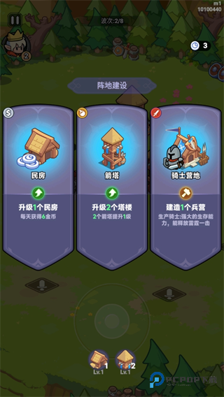 每一次升级都能从三张随机卡牌中定制你的王国: