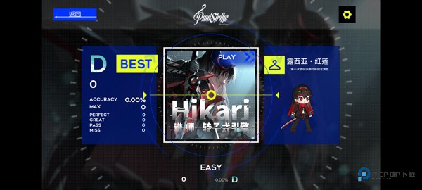 4、设置好后,点击角色,游戏内拥有多首音乐可以挑战,并有着简单、正常、困难三种难度,玩家选择好角色后点击play开始;