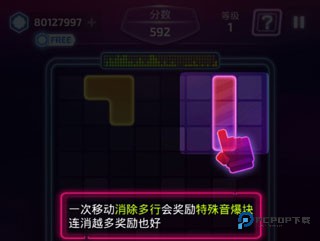 7、一次移动消除多行会奖励特殊音爆块,连消越多奖励也好。
